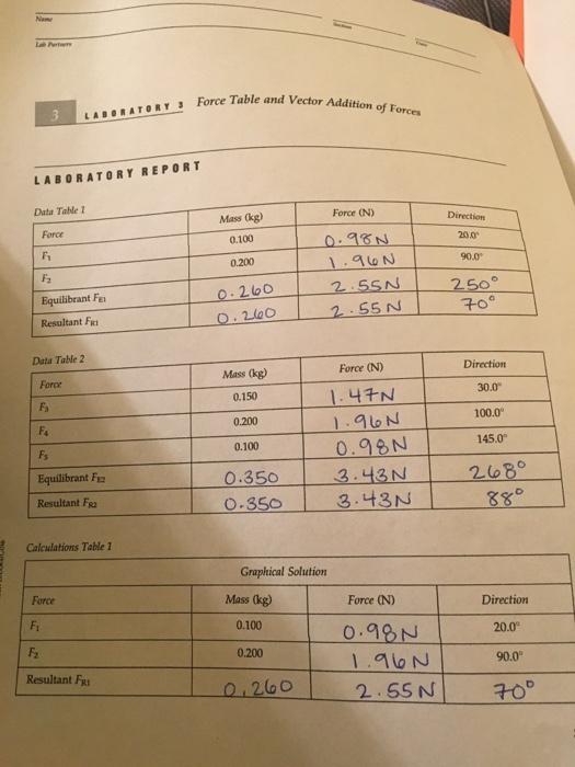 Solved Force Table Lab Report Table 1 Table 2 Force Force Lab Report Force Table To acquaint the students with the first condition of equilibrium and the analysis of. The object of this lab is to gain a thorough understanding of vector. The force table allows us to manipulate and measure the effects of vector quantities. Abstract the goal of this experiment is to find a third, unknown mass using two. A force table can. Lab Report Force Table.